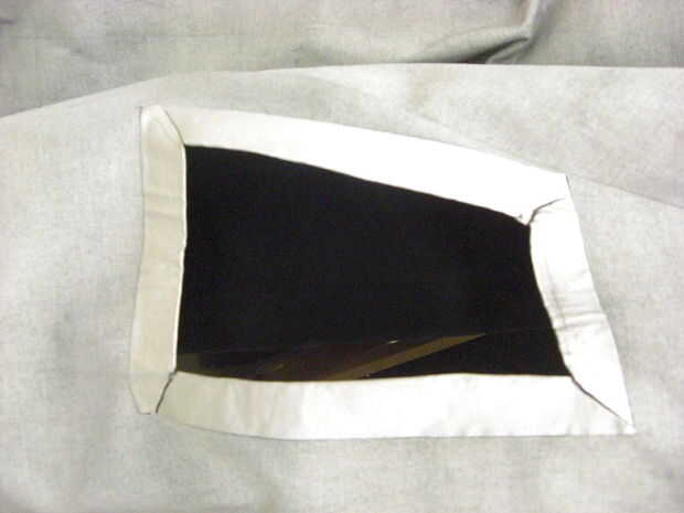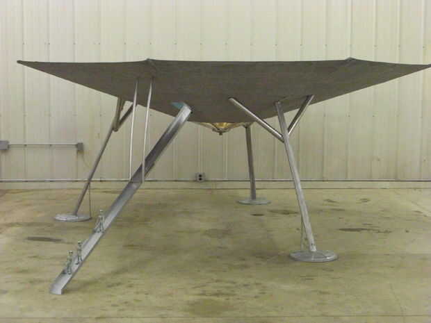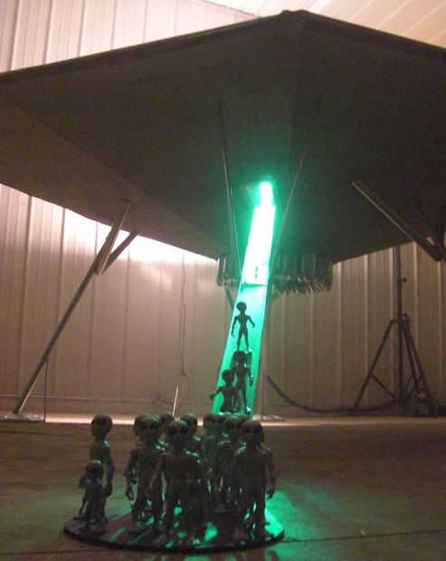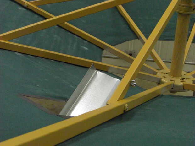 Estratégicamente cortar un agujero en la cubierta del paraguas y bordeado con cinta pintada para crear una escotilla abierta. La parte superior de la canal fue atornillada en el marco de la sombrilla y una luz verde del punto apuntaba hacia abajo de la rampa. El efecto de contraluz se ve genial.