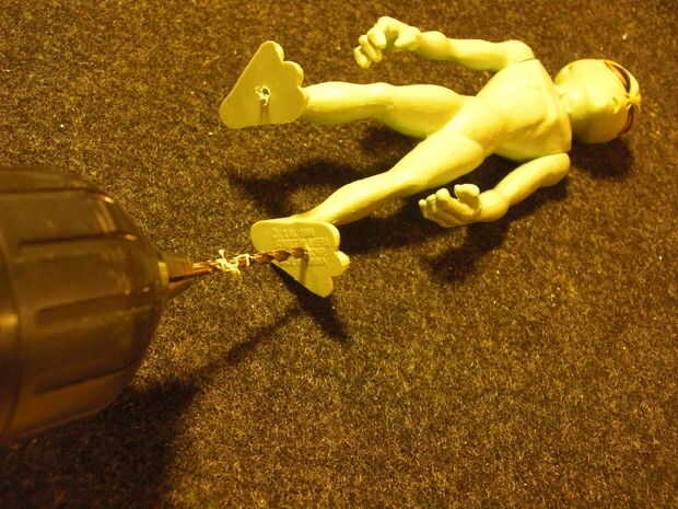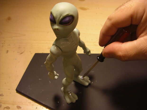 Primero, corte y había pintado de un negro base madera. Después de arreglar a los alienígenas en un agrupamiento al azar, había marcado su lugar, perforar agujeros a través de sus pies y había atornillado en la base. Hice lo mismo con los tres extranjeros en la rampa (que es un canal de aluminio).