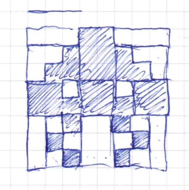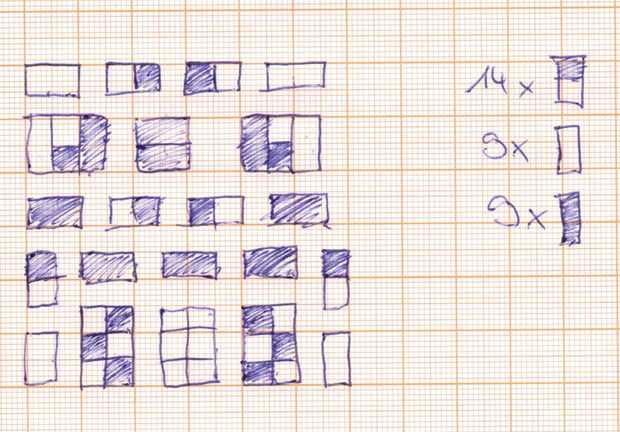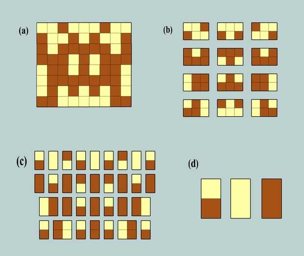 Ahora hemos dividido nuestro cuadro en trozos útiles (b). Están fáciles de trabajar con las piezas de 2 x 6 y no confunde mientras apila más adelante. Si miras más te aviso que podemos dividir en 1 x 2 piezas (c). Esos pedacitos, negro, blanco y negro (d) son los "legos" construiremos nuestras barras de galleta con. Desde este punto te referencia a ellos como ladrillos.