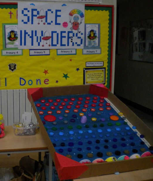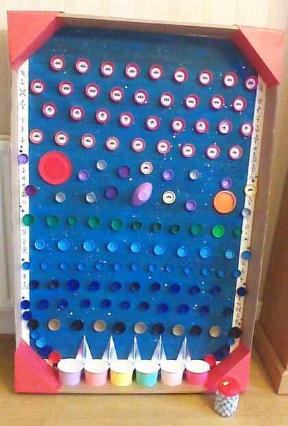 Este es un juego que hicimos para la fiesta de la escuela, utilizando una paleta de cartón reciclada, bebidas botella tapas, algunas tazas de helado de fiesta, tarjeta de repuesto y un montón de pegamento caliente. La idea es como bagatelle (o pinball pero sin las aletas); se le cae una canica en la parte superior y sus rebotes abajo los obstáculos a la tierra en uno de seis botes. Las ollas todas tienen diferentes premios adjunta, de 'Lost in Space', 'Recarga Rocket' (juego nuevo) dulces y premios con temas de dinero de bolsillo de pequeño espacio, basado en las probabilidades de aterrizaje en una olla.