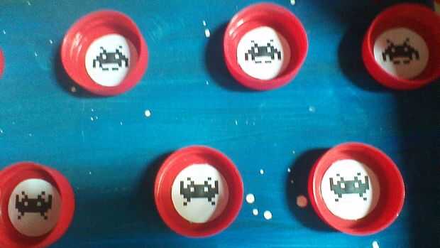 Las tapas de botella roja y naranja tienen inserto un poco 'space invader', que fueron impresos de una fuente descargable gratis desde www.fontspace.com : invasores de dustBUST.