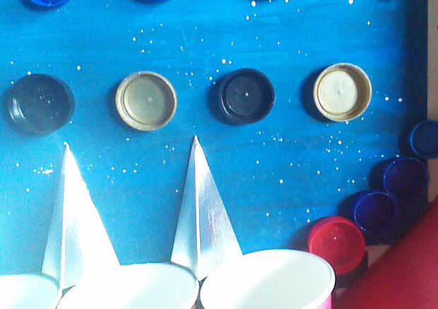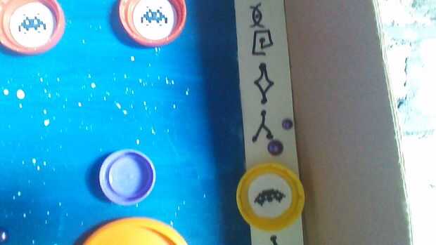 Necesita tener tapas de botella en el extremo de algunas filas que ir a la derecha hasta el borde, lo contrario una canica caer el lado caerá hacia la parte inferior sin rebotan. Pero luego hay un pequeño bolsillo donde fácilmente se atascan los mármoles. Barajamos hacer pequeñas cuñas de tarjeta mini, pero en su lugar a lo largo de las tapas de botella de borde acumulan algunos golpes extras de pegatinas 3d utilizados para adornar las tarjetas, para evitar que se pega en los bolsillos de los mármoles. Esto no es una solución perfecta pero logró desalentar más canicas de ser atrapado.
