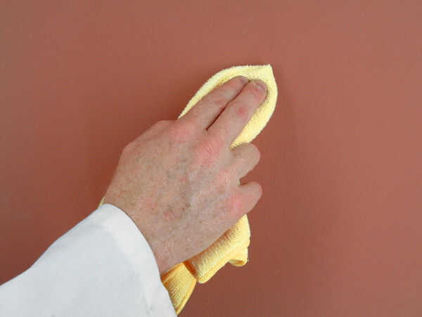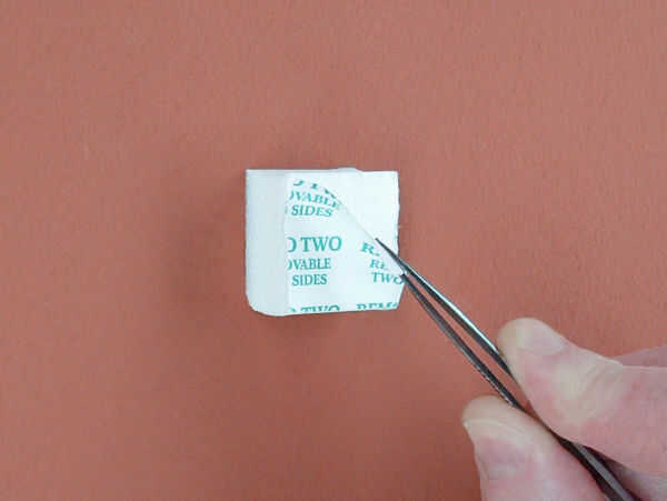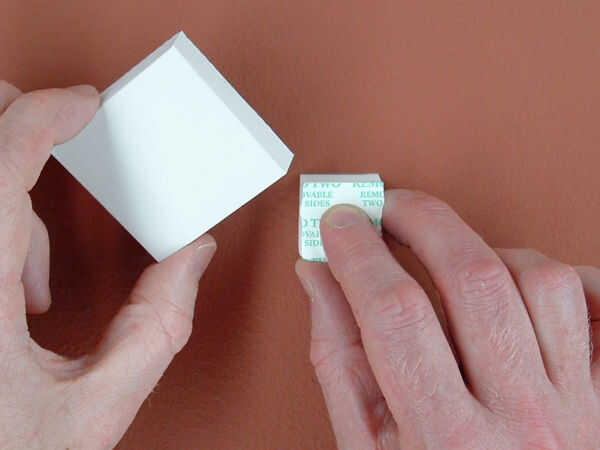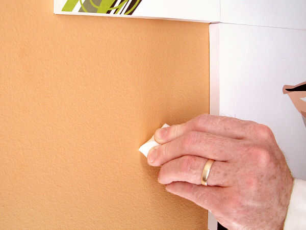 Quitar un bloque de adhesivo de la hoja, coloque el panel en la pared y mantenga el bloque sobre el centro del panel. (FOTO 6-4)