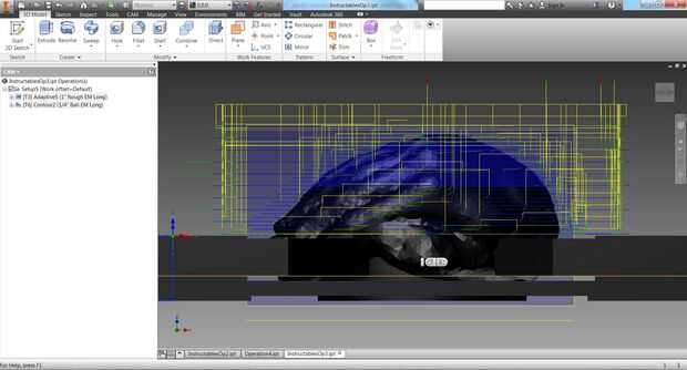 Luego un contorno se utiliza para limpiar la superficie, pero como se puede ver en la última foto, no enviarlo hasta el fondo, ya que iba a usar 3 + 2 mecanizado de ejes para venir en esta compleja geometría de los lados.