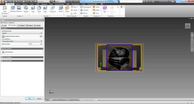 Para no pasar tiempo cortando el aire por encima de las pestañas, he especificado en mi operación adaptable para cortar justo por encima del perfil delineado en azul, que es por qué dejé que la superficie en mi modelo. Puedes ver la operación sólo funciona en el centro de la parte, que pasa a corresponder al lugar donde hay material. La adaptación entonces áspero claro del material alrededor de las manos.