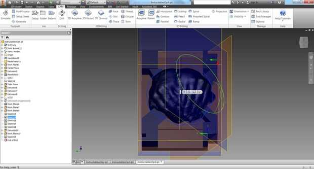 Esto también requiere cuidadosamente dibujar bocetos delimitadores alrededor de las áreas que le gustaría a máquina. Puesto que ahora el eje z se mide perpendicular al nuevo plano, no la mesa de la máquina, se debe especificar una zona estrecha en la que desea que la herramienta hace cortes. Se puede ver en la foto cómo bosquejado en uno de mis planos de referencia de 45 grados la zona en la que quería trabajar a máquina para producir.