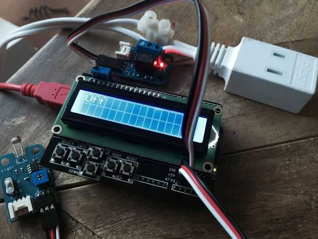 EL código es básicamente el código del ejercicio del sensor de luz, pero modificado con un pinMode(A2,OUTPUT) en el programa de instalación para activar el temporizador, En el condicional si activamos o desactivamos el contacto con el comando digitalWrite(A2,HIGH) o digitalWrite(A2,LOW). Listo, cargar el código y ponerlo a funcionar como se muestra en la foto.