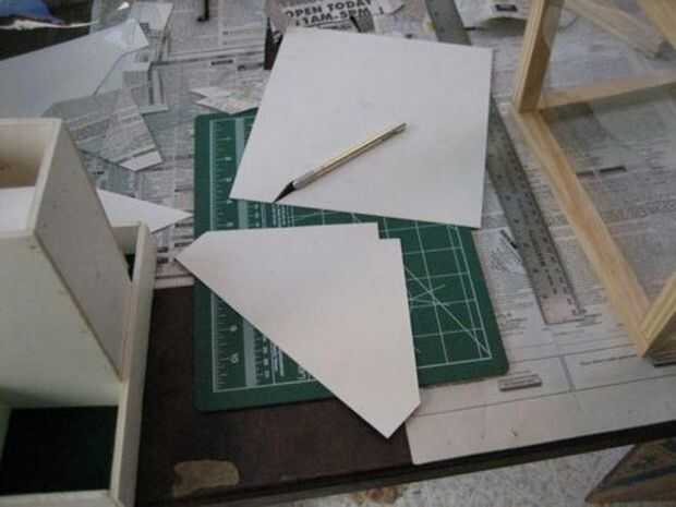 Piezas triangulares para los lados de la azotea donde un poco más complicado, pero localizar el lado del techo en la cartulina recorte y luego mantenido tratando de ajuste y corte de piezas hasta que lo hizo. Vino bien.