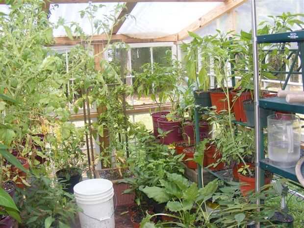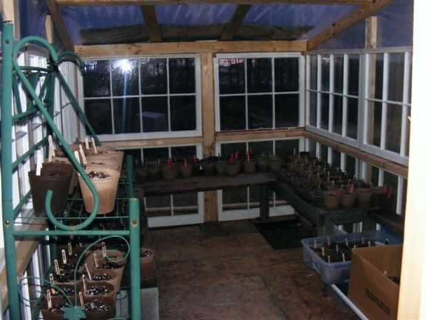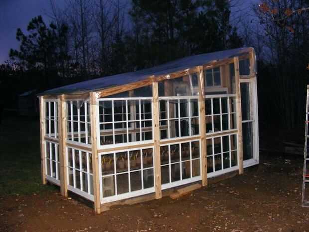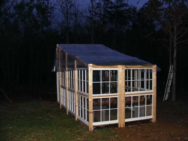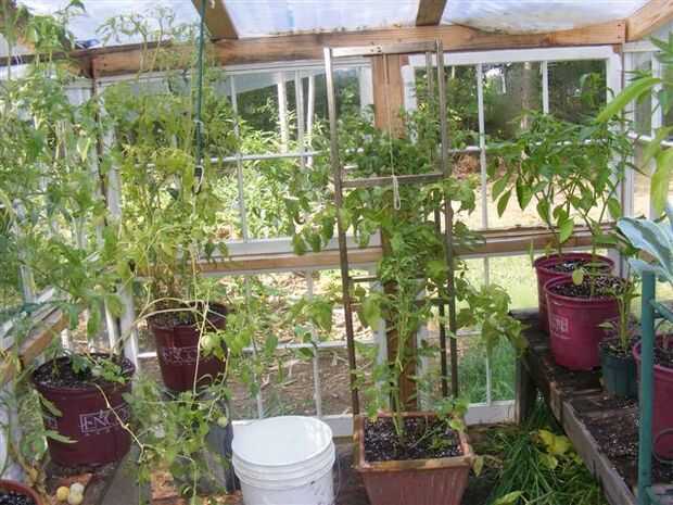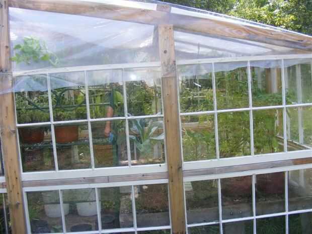 Una vez que se realizó el primer nivel de ventanas en tres lados, ponemos el segundo nivel de windows. Frank corta todos los 2 x 4 en la parte superior para hacer el ángulo de la azotea. Poner 2 x 4 "apoya" a lo ancho de la cubierta y había estirado de plástico encima y con grapas de plástico por los lados para cubrir los huecos restantes. Otra vez, si quieres más bonito se puede utilizar madera o cristal en vez de claro, plástico pesado. Entonces nos cubrió con techos plástico corrogated (?) para proteger aún más lo había clavado ésos hojas juntos y el invernadero apoya el techo.