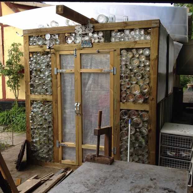 3. pila de los frascos con el abierto fin hacia dentro de la estructura de madera.