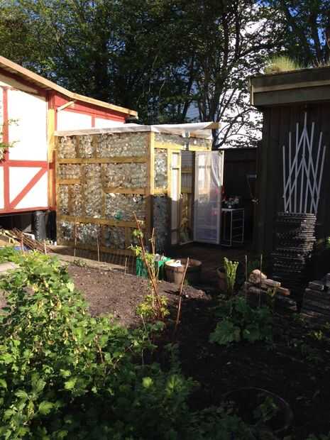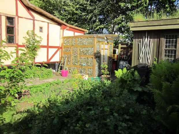 8. techo - todavía estoy buscando una muy buena solución, primero tuve una lámina de plástico con grapas en. Mi segundo intento fue con algunas láminas de plástico termo - esto se ve mejor que el encerado y aísla mejor pero no es fácil de encontrar como un material reciclable... Creo que tal vez en un "techo verde" (hierba de estar cubierta) sería óptimo. tal vez utilizar algunos frascos o botellas como tragaluces... pero no tengo una buena solución para la construcción de realidad tal construcción (todavía)