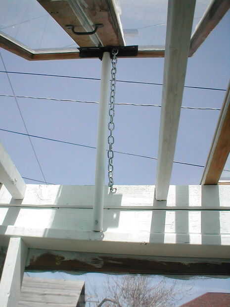 Este año fue capaz de obtener un gran ventanal y decidió instalar un techo ventana esta primavera. Permitirá más luz y por lo tanto calor. Usé los mismos tornillos de la cubierta para colocar las ventanas en el marco del techo que ya había construido. Para los respiraderos de la azotea, tomé dos ventanas y les atornilladas. Encontré viejas bisagras y utiliza un trozo de PVC como un corsé. He añadido un tornillo que sostiene a la estructura como un pasador. Por último, en caso de una gran ráfaga de viento llegó y trató de abrir un tirón las ventanas, clavó una pequeña cadena para el marco y la ventana para evitar que la ventana golpeando hacia atrás en el resto del techo.