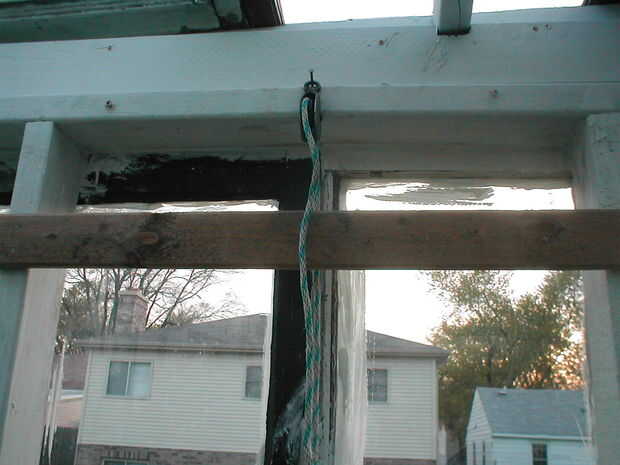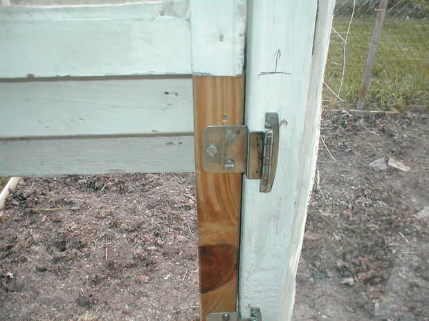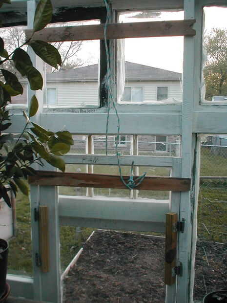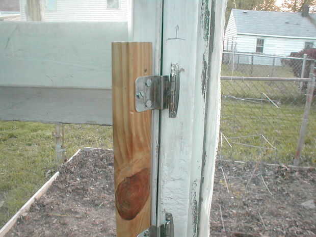 estaba descontento con tener eliminar la ventana de ventilación/ventilador y tener que sostener contra algo mientras se enfría el invernadero durante el día. El marco ya fue diseñado para adaptarse a la ventana en él. Decidí que se deslice hacia arriba y se mantiene en su lugar. Comencé por salvar algunas bisagras de un centro de entretenimiento. Son el tipo que se siente completamente fuera de la puerta. Además de éstos tenían una forma única que alrededor de un ángulo recto. Esto permitió que la madera "paradas" swing en el lugar y levantar la ventana mientras estaba de ventilación o cuando el ventilador está en su lugar. En el marco clavó algunas placas para sujetar la ventana ventilador contra el marco. Por último, encontré una vieja polea y sujeta a la ventana así que puedo tirar para arriba fácilmente.