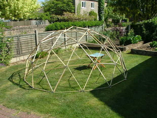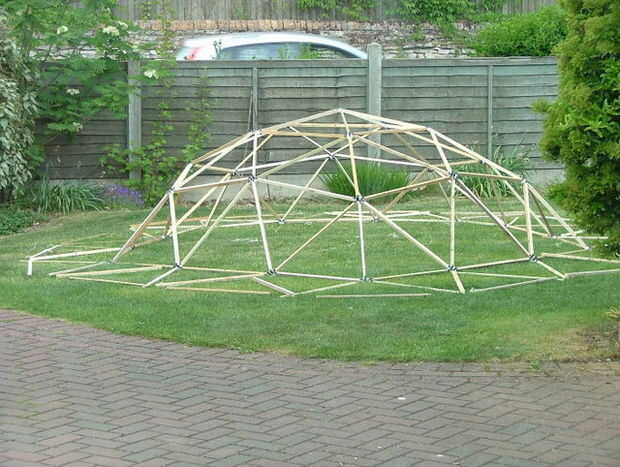 Sentado en el césped todos los puntales fueron establecidos y luego conectar. (Tal vez imprudentemente) decidí construir de arriba hacia abajo porque esto significa que tienes que levantar todo el peso de la cúpula para agregar más struts.