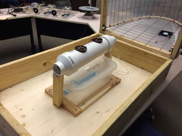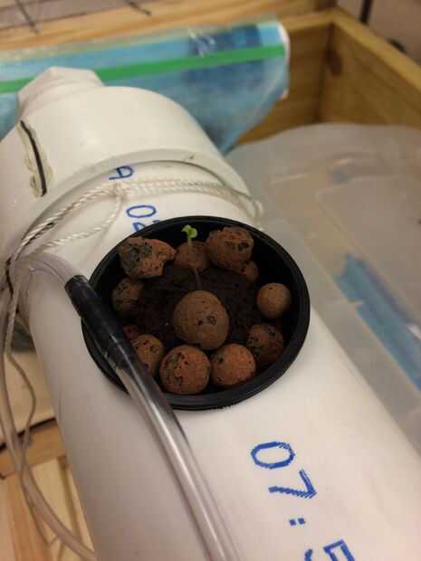 El sistema de hidroponía consiste en un tubo de pvc de OD 3" con dos 2" agujeros de la parte superior de las macetas de la malla. Ellos están espaciados 3" para dar a cada planta suficiente espacio para enraizamiento y crecimiento. Se utilizó un sistema de goteo para proporcionar la solución nutriente a las plantas y un orificio de 1/4" fue cortado de la parte inferior del pvc para permitir que el agua vuelva al depósito abajo. Las bombas de aire y el agua están ambos conectadas a un interruptor de interrupción que controla desde un segundo Vacío paralelamente al lazo principal de vacío. Esto se hizo así que pude desactivar las bombas para cambiar la solución nutritiva sin afectar al resto del sistema. (Fotos 3, 4 y 5)