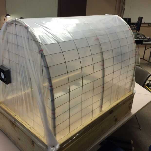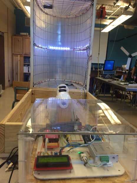 Una simple lámina de plástico se utilizó para cubrir la capota y crear un ecosistema aislado de las plantas. Se utilizaron dos ventiladores en serie para mover aire a través del invernadero. Uno que tire aire y uno para sacar el aire. Esto se hizo para enfriar el invernadero tan rápido como sea posible y para simular una brisa. Los ventiladores están programados para ser apagado cuando el DHT11 mide temp < 25 * C y para encender cuando temp > o = a 26 * C. Esto se mostrará en la parte del sketch del instructable. (Foto 2)