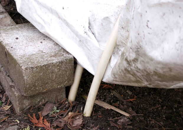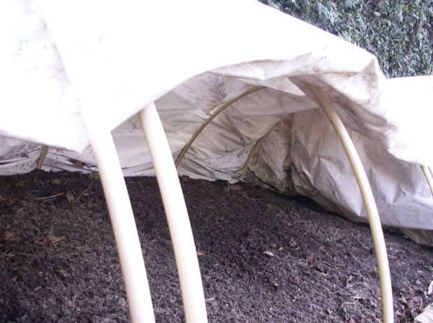 Ahora, te asegure con firmeza el plástico con las piedras. Primero doblar el plástico por todos lados y luego poner ladrillos encima de ellos. Será suficiente un solo pliegue de cada lado largo del invernadero, pero los lados cortos del invernadero serán necesario doblar más rigurosa. Asegúrese de que todas las partes son bien selladas cuando el invernadero operacional (por ej.: aplicación de agua y aumentar la humedad para dejar los esquejes de la planta a tomar raíz) para sellar todo bien, podemos colocar un solo ladrillo cada 80cm de plástico y hacerlo por todos los lados del invernadero.