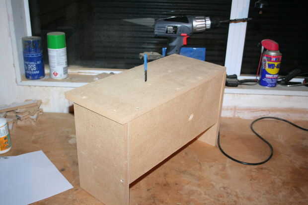 1. usando un trozo de MDF que tenía puesta en el garaje construyo un open box 43 cm (longitud) x 19 cm (ancho) x 27 cm (altura).