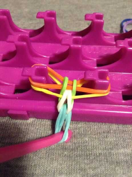 Todo lo que haces es simplemente agregar bandas en la parte superior se empuja entonces hacia la banda inferior a través de la banda media. Eso es todo! Usted puede tire suavemente de la banda inferior como en la foto después de levantar cada banda y usted comenzará a ver el patrón. Continuar hasta la longitud deseada.