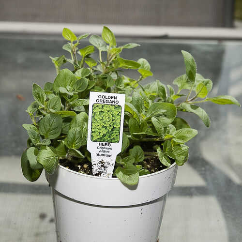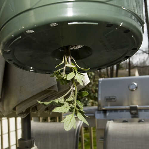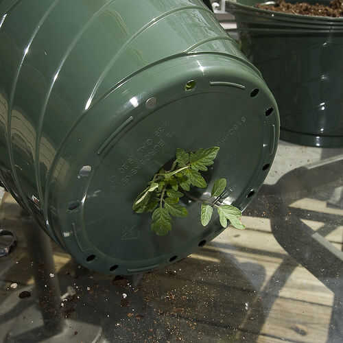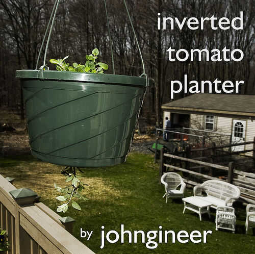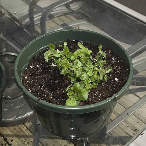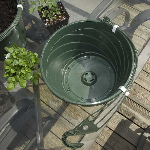 El diseño es simple: básicamente es una jardinera colgante con un orificio en la parte inferior y una planta de tomate empujado a través del orificio. En la parte superior de la maceta se puede ponerlo que quieras: flores, hierbas u otras plantas pequeñas. Estoy usando orégano, porque se puede fácilmente cultivar en una maceta de este tamaño, y hace un maravilloso condimento para los tomates en una ensalada fresca.