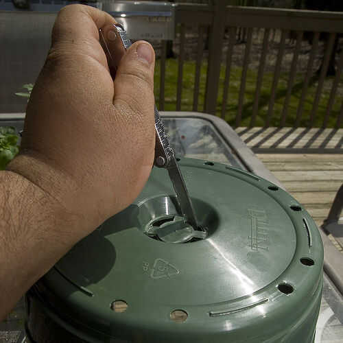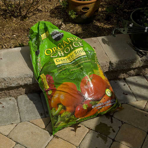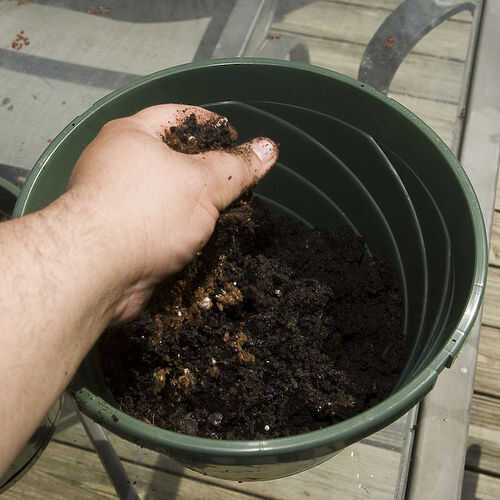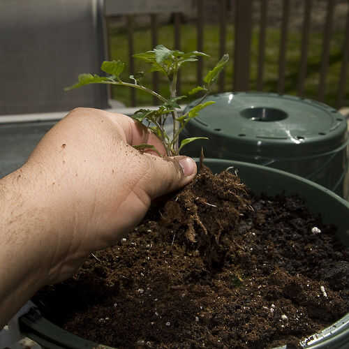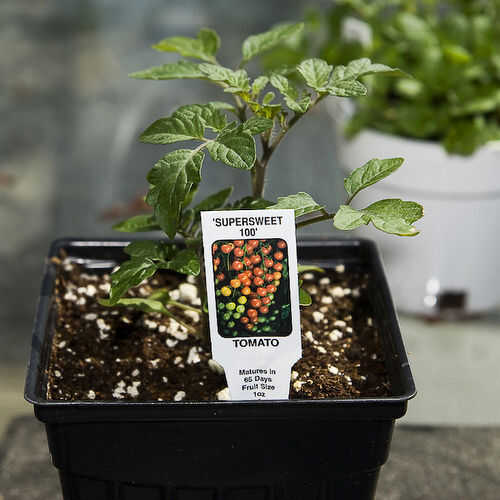 Los tomates que estoy usando son de una variedad llamada "Supersweet 100". Que he crecido estos para el pasado que pocos años y son simplemente deliciosas--dulce y agrio con un bocado crujiente. No son muy grandes, sobre el diámetro de un centavo, pero eso está bien para nuestros propósitos. Tomates más pequeños mejor en estas jardineras que las más grandes, que requieren más espacio y suelo. También, tomates más grandes tienden a pandearse hacia el suelo, que pone estrés en el tallo de la planta.