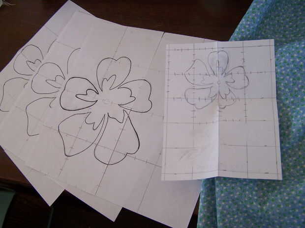 Estoy utilizando un método de la vieja escuela de la ampliación de un diseño de la tela principal de mi falda. Voy ampliar una vez más el real tamaño desee (también porque realmente estoy haciendo 3 faldas, necesitaba copiar la imagen 3 veces). Esto me ayudará a evaluar qué tamaño debe ser mi tela "peek-a-boo". Usted querrá al menos 5/8 pulg. subsidio para la tela de "P-A-B". Quería mantener ordenado mi tela "P-A-B" así que decidí que un simple cuadrado con los bordes dobladillados funcionaría mejor.