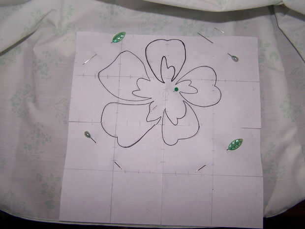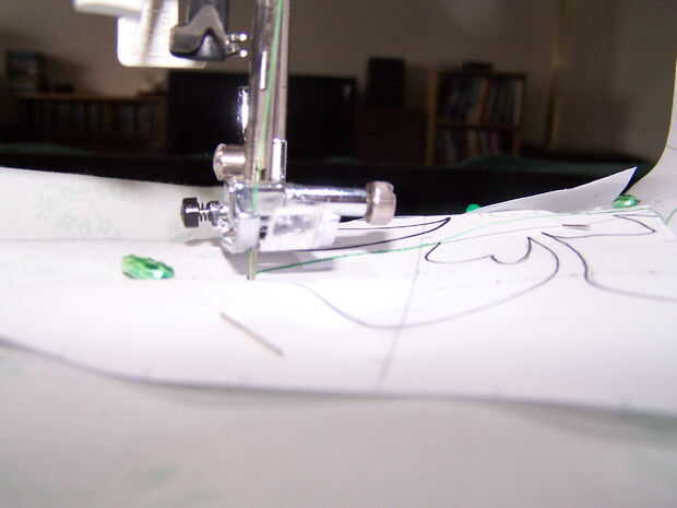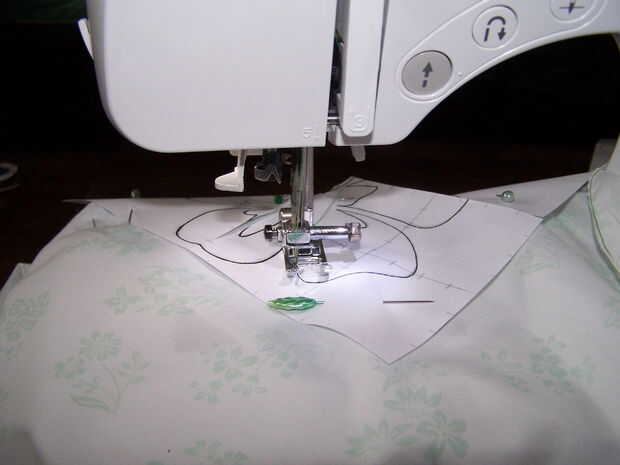 Ahora, no tengo una máquina de coser de casa de lujo. No uno que simplemente puedes subir una imagen, un botón y listo! Sigue el contorno de la imagen. No, tengo que hacer esto manualmente... por eso pin mi diseño en la parte superior, por lo que yo puedo seguir el esquema. Inicio. Parada. Torcer, girar, ajustar. Inicio. Parada. A su vez. Inicio. STOP... esta es la lección de paciencia. Sea paciente con usted mismo, su máquina y su proyecto. Comprender que cuanto más complejo el diseño, sin la máquina de coser de casa de lujo, el más largo y más tedioso puede ser. Pero entonces también puede deleitarse con en cómo impresionante resultó y que le hizo lo mismo!! : D