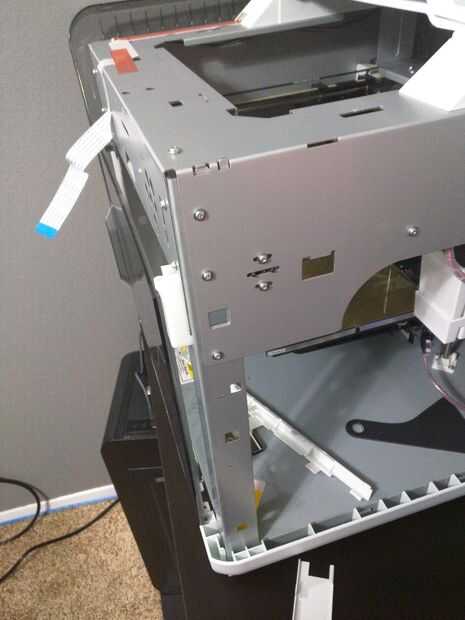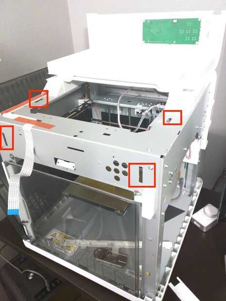Usted tendrá que quitar los paneles laterales y panel superior que alberga la pantalla LCD. Los paneles laterales se realizan con 5 clips por cada lado que se encuentra en la parte superior de la impresora y pueden apalancar un flathead destornillador.
