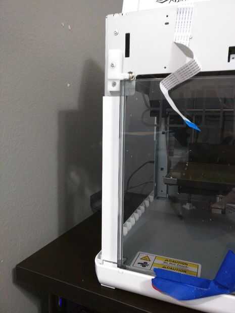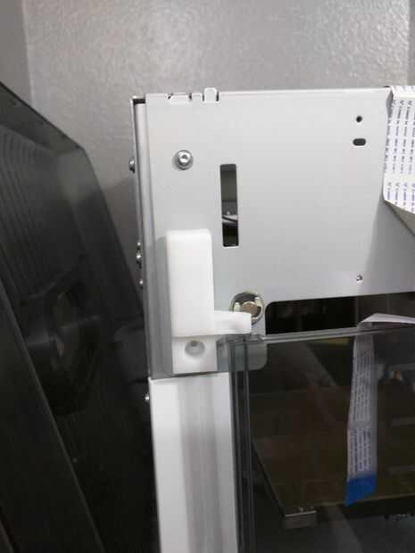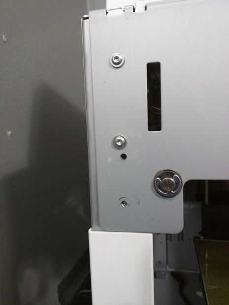 Montar la puerta hacia abajo con el panel lateral derecho en la impresora y fije la bisagra de plástico blanco en el lado izquierdo con el orificio del tornillo en la parte inferior. Alinee la bisagra para que todos los lados incluso y la puerta se cierre correctamente. Perfore un agujero en el marco del metal de la impresora utilizando el orificio de la bisagra. No recomiendo usar el tornillo torx original como mina como que me aprieta todo Continuación elige otro lugar en la rótula plástica y perforar otro agujero, esto evitará que la bisagra se tambalea. Usted debe usar una cabeza plana Tornillo aquí como este es donde el bombeo.