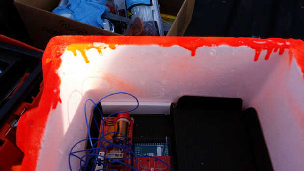 Además de esto, tuvimos una pequeña caja de cartón que encajan perfectamente en la parte superior de la caja de la espuma de poliestireno, que contenía el Arduino mega 2560, tablero contador Geiger, escudo de tiempo (conectado a Arduino, por supuesto) y OpenLog. Este diseño puede verse en el esquema representado en el papel milimetrado.