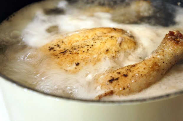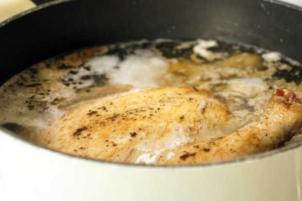 Añadir el agua filtrada y el vinagre a la olla y cubra completamente el pollo.