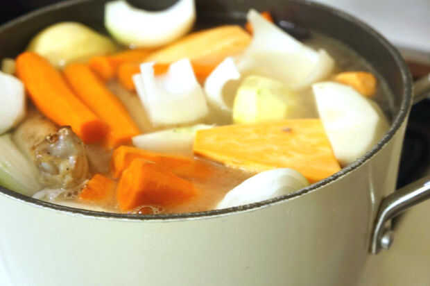 Agregue cebolla, batata, chirivías, nabos, ajos y zanahorias.