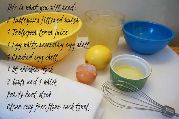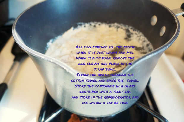 Consomé es un caldo muy claro para sopas claras y salsas. Hacer el consomé tan pronto como se hace el caldo, se tarda unos diez minutos para hacer consomé y tienen pocos ingredientes. Hay dos de nosotros en casa, así que generalmente dividen la acción en la mitad y usar la mitad para los resfriados y chimenea y utilice la mitad restante para consomé. Me gusta ahorrar el consomé para cenas especiales porque es tan bonita y se ve como un asunto de lujo cuando realmente no es todo lujo. Tiene un gran sabor. Para ahorrar tiempo y ser organizado; Hacer la sopa de pollo, caldo de pollo y consomé en el mismo día. Guarda limpia encima de tiempo en la cocina y el tiempo de cocción.