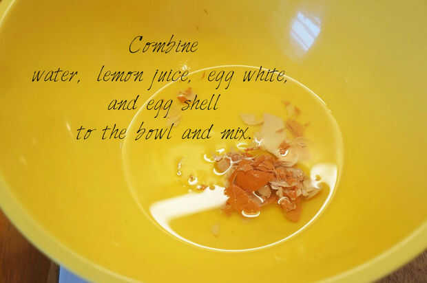 Mezcle 2 cucharadas de agua filtrada, 1 cucharada de jugo de limón orgánico, 1 clara de huevo orgánico y uno triturado cáscara de huevo y mezclan todos estos ingredientes en un bol.