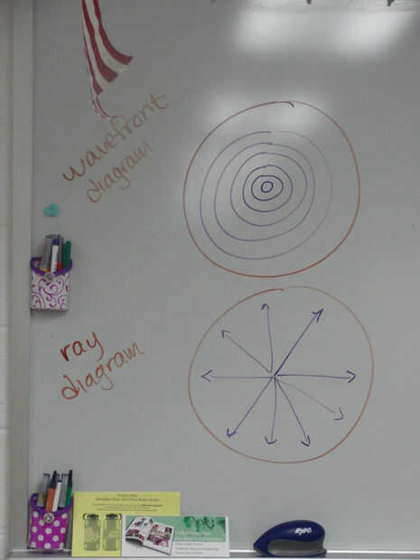 Mientras los estudiantes están terminando sus investigaciones, es importante que registre sus observaciones en como claro un detalle como sea posible. Introduje dos métodos de registro de las observaciones, un diagrama de frente de onda y un diagrama de rayos. Un frente de onda diagrama ilustra la forma de la parte delantera de la ola mientras que viaja. Un rayo es un vector que sale perpendicular a la frente de onda en la dirección que la onda está viajando.