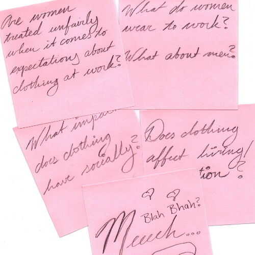 Ejemplo: ¿Qué las mujeres usan para trabajar? ¿Los hombres usan para trabajar? ¿Ropa afecta la promoción y contratación? ¿Qué impacto ropa tiene socialmente?