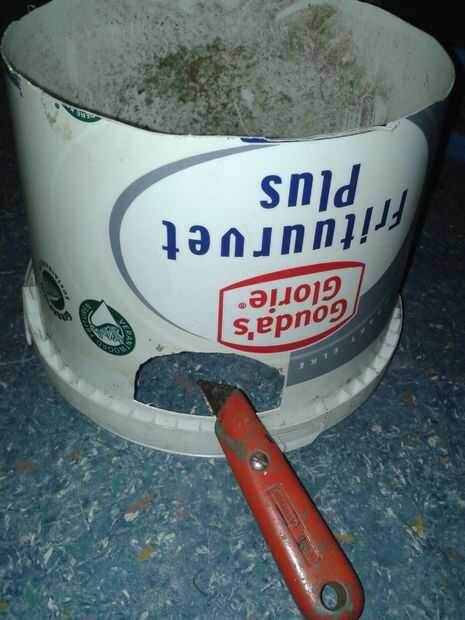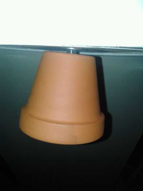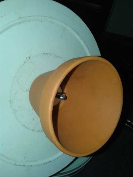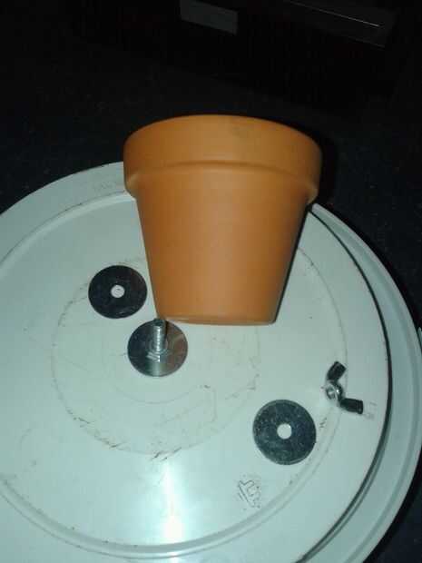 montar la olla de barro primero una tuerca sobre el perno, para algunos poco distancia entre claypot y bucketbowl fondo para el claypot se calienta mucho. Luego un anillo de metal para asegurarse de que el agujero en el claypot está cerrado también. Entonces el claypot otra vez un anillo de metal y una tuerca para apretar él junto. También hacer una abertura en el lado del cubo. Esto es para fácil aclarar las necesidades de fuego O2 y candel posteriormente