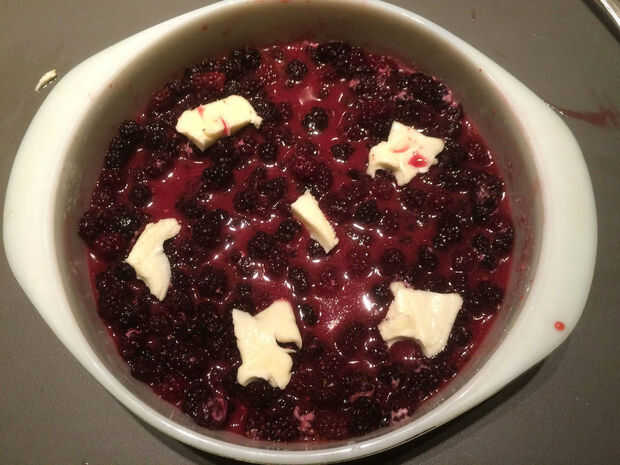 Rociar 2 cucharadas de congnac, bourbon, brandy o ron encima de la mezcla de la baya. Superior con palmaditas igualmente distribuidos de mantequilla.