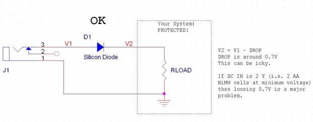 Sin embargo, si usted tiene menos de 0.7V de margen en su sistema, puede sustituir el diodo por un diodo de Schottky. Esto hace que su caída hasta 0.3V. Mejor, pero todavía no grandes. Por ejemplo, si está ejecutando un sistema de 2 pilas AA, aún no puede permitirse la caída ~0.3V de un Schottky porque puede tener un chip que requiere 2.0V a correr y las células de NiMH fondo en unos 1. 0V / célula.