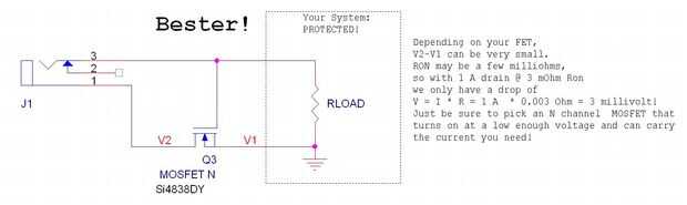 La tercera imagen muestra un simple truco para protección de polaridad inversa que tiene un voltaje mínimo de la gota en el dispositivo de protección. En este caso, utilizas un MOSFET de canal N en el lado (negativo) de la vuelta de su proyecto.