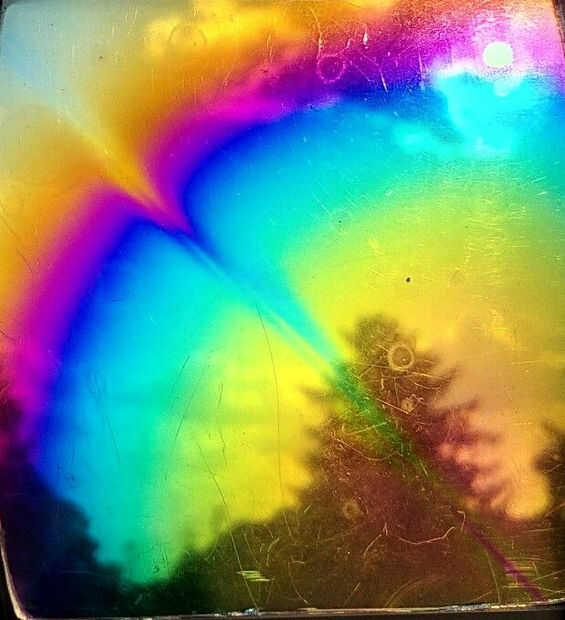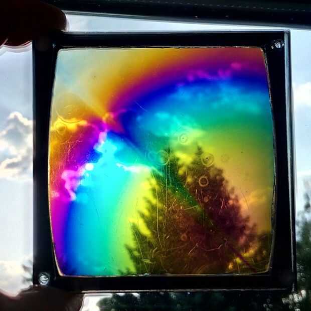Aquí un pedazo grande de poliestireno fue colocado en el marco y le dio un agradable y colorido patrón de arco iris.