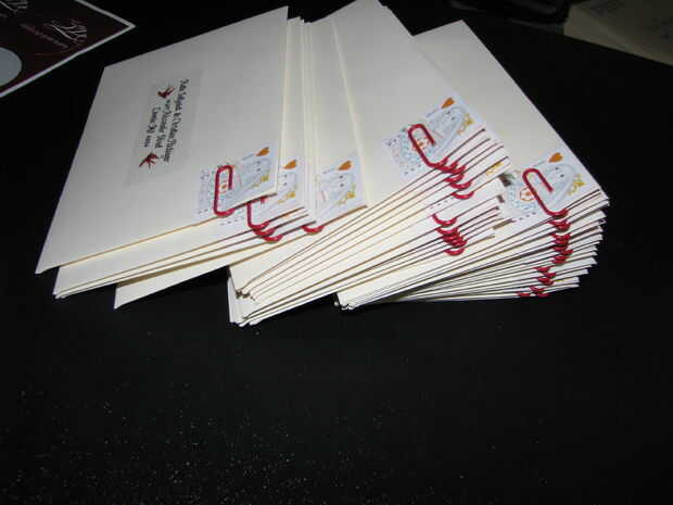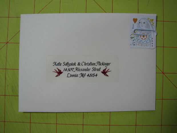 Para RSVP sobre de devolución, nos dio a nuestros huéspedes la opción de guardar un sello y RSVP online. Cortar los sellos y recortado de papel para sobres de retorno. El tamaño de la envoltura encontramos que encajan perfectamente la tarjeta RSVP era 5 1/8 "X 3 5/8"., de esta forma, los huéspedes podrían reutilizar el sello en otra cosa si querían. Compró algunas etiquetas de dirección en el Staples, diseñado y les impreso y había pegado en las tarjetas.
