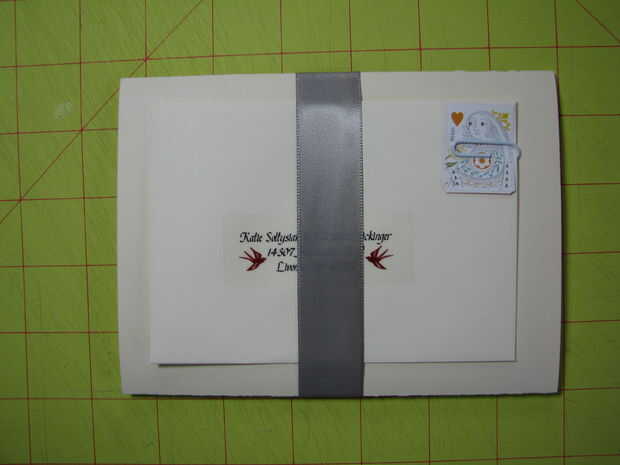 El sobre de devolución de RSVP se deslizó fácilmente entre la cinta y la invitación en la parte posterior. Esto fue una decisión de última hora por mi parte, y realmente creo que parecía perfecta y completa la invitación!