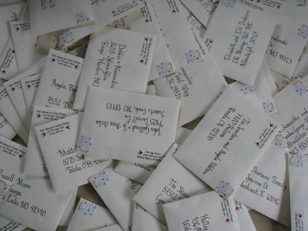 Cosas cada sobre con la invitación después de abordar y sellado con sellos de 2. Es mucho más fácil la escritura de mano y sello de sobres sin cosas en ellos! ¡ No olvides tu etiqueta de dirección de retorno!