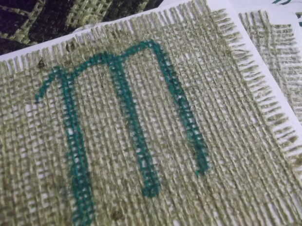 Preparar la arpillera. Corte hacia abajo para que sea ligeramente más pequeño que la cartulina. Luego, tirar 2-3 hilos de cada lado para crear un borde con flecos pequeños. Use la pintura o los marcadores permanentes para decorarlo como desee. Asegúrese de que colocarlo sobre la toalla de papel escribiendo en él porque el marcador sangrará a través.