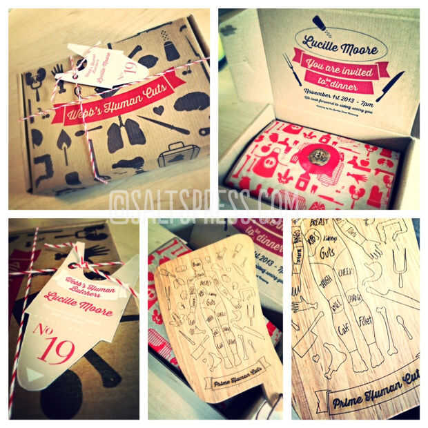 Aquí está una invitación de 2013 y las instrucciones sobre cómo hacer que estos y empaquetarlas. El tema fue una carnicería y la casa fue decorada para que coincida con este tema.