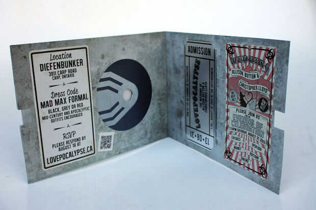 Mi esposo y yo fuimos casados en una boda temática de carnaval post-apocalíptico en un refugio de bomba nuclear. Necesitábamos una invitación cada pedacito tan impresionante como la boda que estábamos planeando.