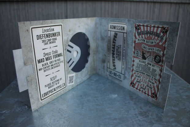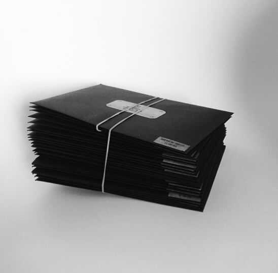 Las invitaciones terminadas fueron puestas en sobres negros y enviadas por correo.