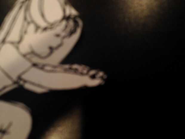 con la ayuda de mi fiel assistiant, recortar una figura de mujer ahora, y poke agujeros a través de su mano (s) Inserte la cadena y cinta abajo