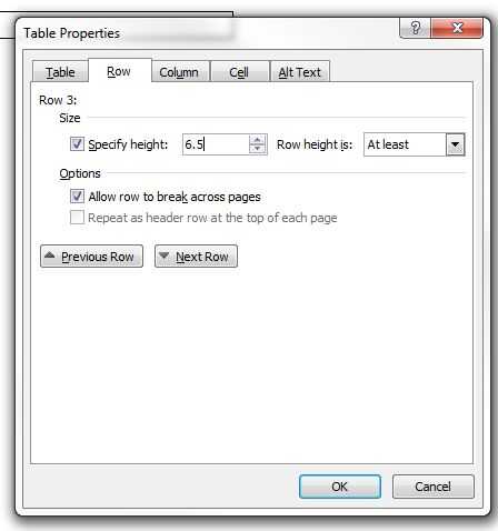 -En la ficha fila, haga clic en el cuadro de altura de especificar e Introduzca la altura de su tarjeta de